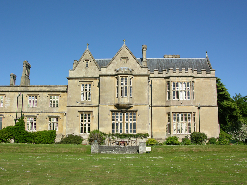 Students practicing Reiki on a sunny lawn in front of the Glastonbury Abbey House.