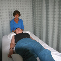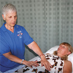 Cecile giving Reiki to Debbie. During low activity times the volunteer staff often give each other sessions.Reiki is definitely the most common healing and stress-reducing modality offered in the Rainbow Room. Other modalities currently offered include Healing Touch, Reflexology, Quantum Touch, Remedial and Relaxation Massage, Far-infrared Dome and Chi Machine, Brennan Healing Science, and others, depending on the volunteer practitioners. Hospital staff come over during their scheduled work breaks. The individual treatment sessions typically run from 15 to 20 minutes. The program runs on Tuesdays from 11 AM to 3 PM and Thursdays from 11 AM to 4 PM for massage therapy. There is one rule we want everyone to follow while in the Rainbow Room: speak only in soft whispers.