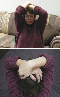In the Reiki class we all worked on him when he was on the massage table on his back. I held his head in the position as indicated in the picture; the others put their hands over the areas that were crossed. He said he could feel the energy move through him and bubble, and he saw light. After treating him for approximately thirty minutes, we asked him to stand and then to walk. We could not believe our eyes. He stood with his feet apart and very stable. He walked with his arms swinging left leg with right arm and the reverse. His body unscrewed itself, and he was also standing upright.